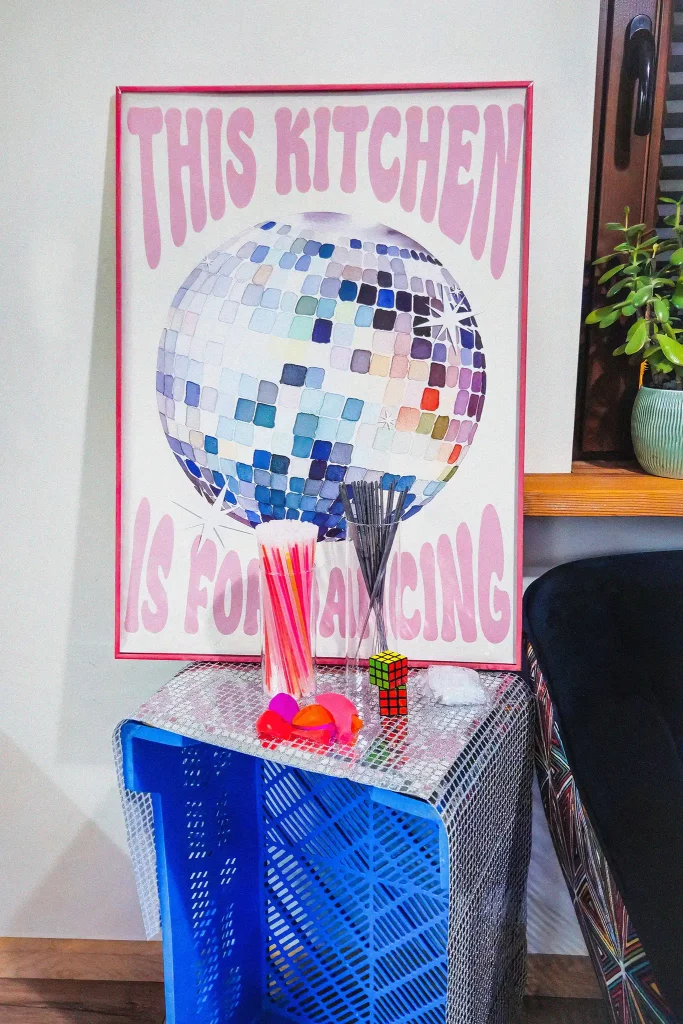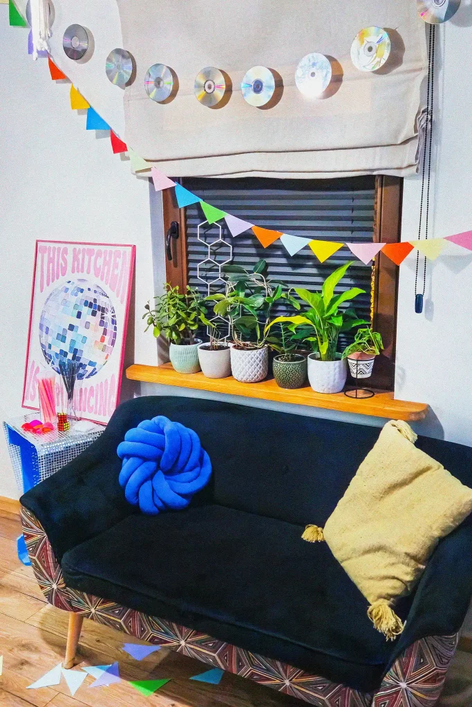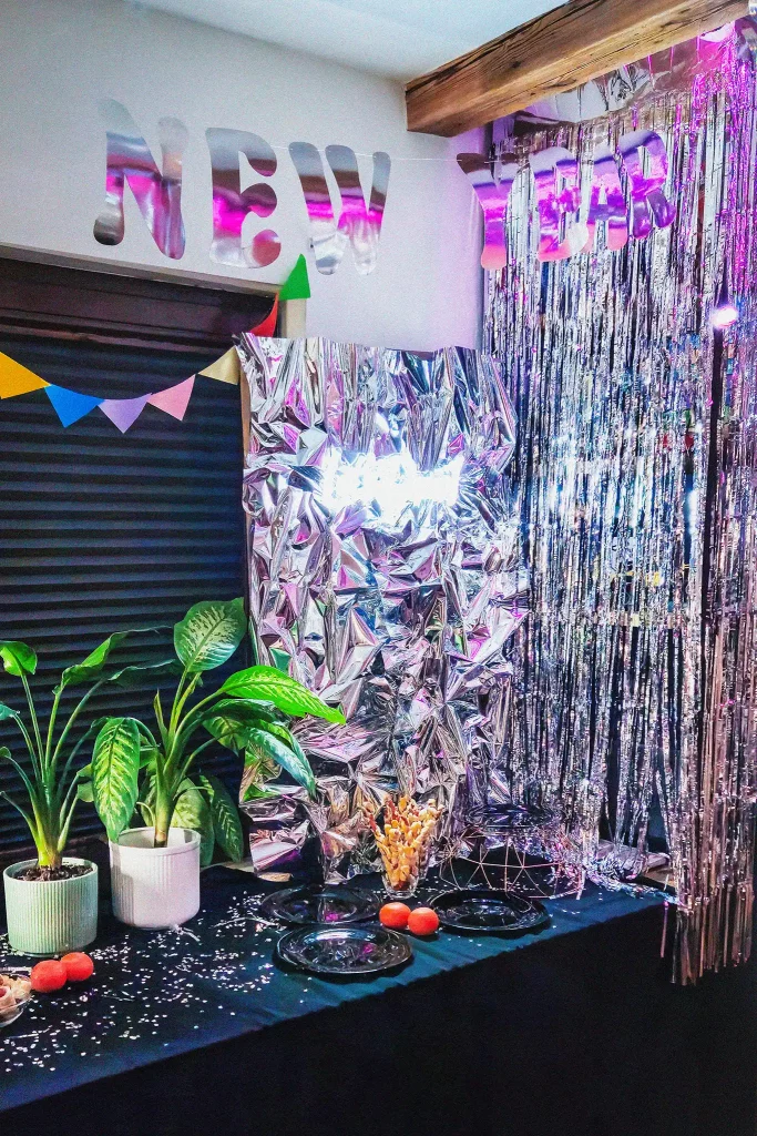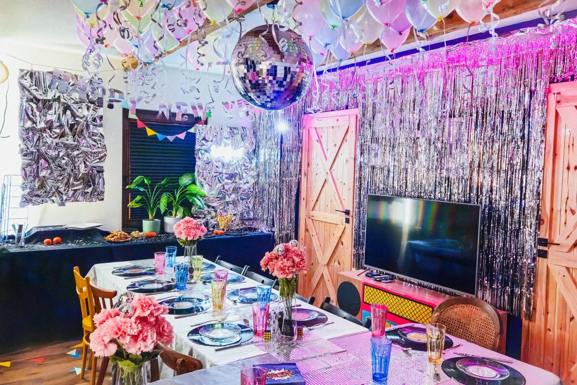 ✦ Srebrne kurtyny, ✦ lustrzana kula dyskotekowa pod sufitem, ✦ cekinowe obrusy – to wszystko ma za zadanie rozpraszać światło po całym pomieszczeniu. Im więcej „bling-bling”, tym lepiej, bo goście poczują się, jakby weszli do prawdziwego klubu disco, a nie… zwykłego salonu!