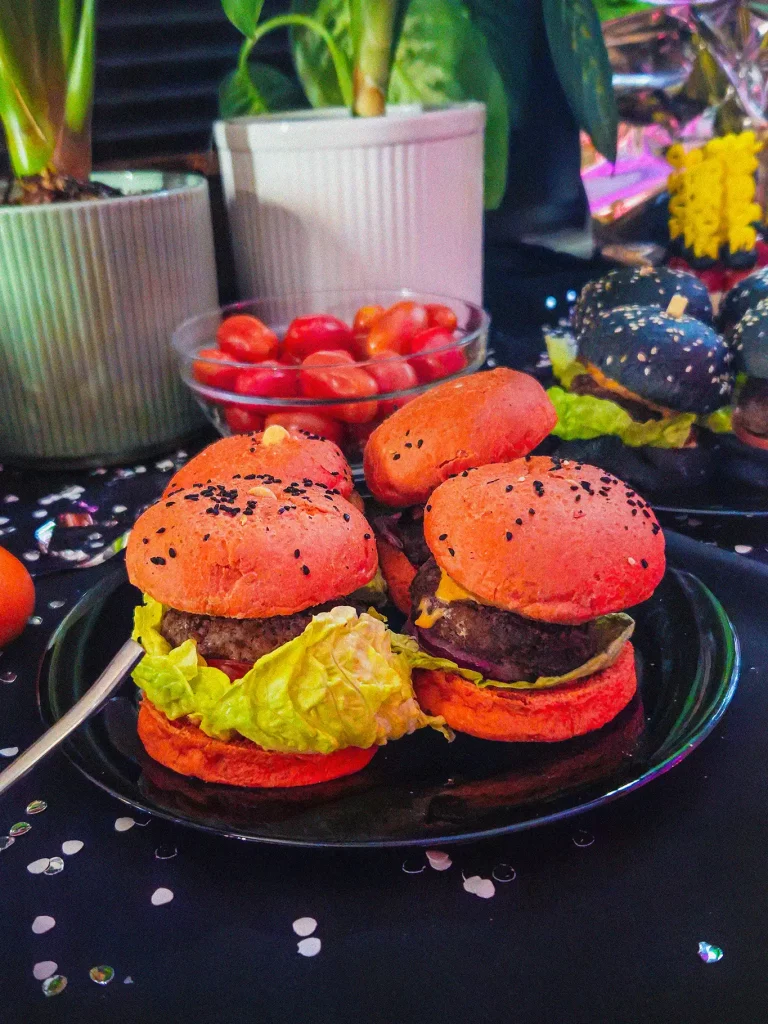 - burgery – klasyczne albo w różowych i czarnych bułkach, jak nasze,